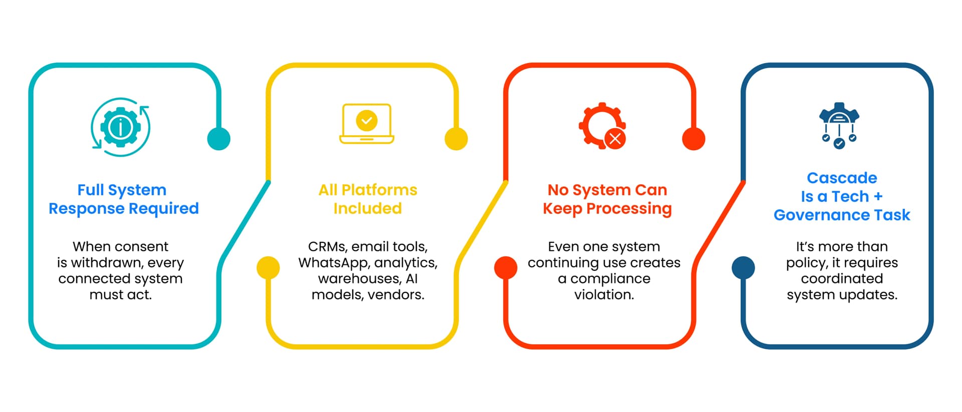 Consent withdrawal is not a channel level event. It is a system wide instruction that must cascade across every platform, dataset, workflow, and vendor that processes the individual’s data for that purpose.
